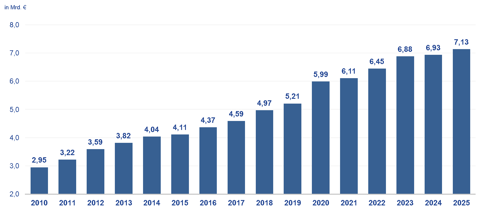 Der KFA ist in den vergangenen Jahren kontinuierlich gestiegen, auf nunmehr über sieben Milliarden Euro für 2025. Auch in den Jahren der Corona-Krise, die einbrechende Steuereinnahmen brachte, hat das Land die Kommunen gestützt und den KFA weiter steigen lassen. Die folgende Grafik gibt einen Überblick auf das stetige Wachstum des KFA in den vergangenen Jahren: